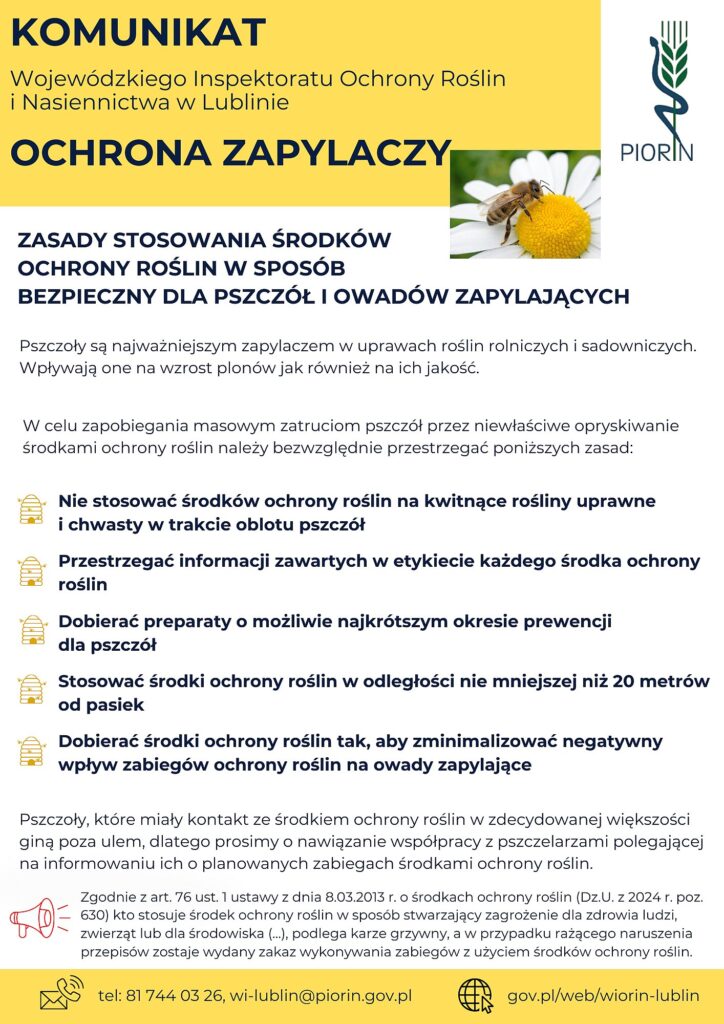 • Komunikat Wojewódzkiego Inspektoratu Ochrony Roślin i Nasiennictwa w Lublinie dotyczącey zasad stosowania środków ochrony roślin w sposób bezpieczny dla pszczół i owadów zapylających(current)
